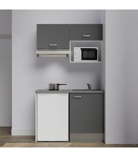 CUISIBANE Kitchenette K02L-PT - 120 cm avec plan de travail et évier - emplacements frigo, hotte et micro-ondes Façade Gris - Plan Gris - Evier Noir