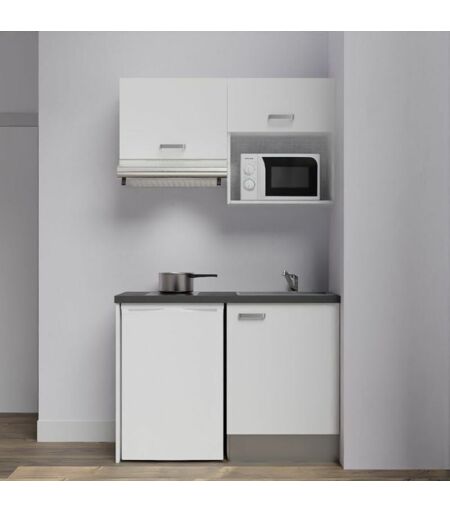 CUISIBANE Kitchenette K02L-PT - 120 cm avec plan de travail et évier - emplacements frigo, hotte et micro-ondes - Façade Blanc - Plan Noir texturé - Evier Inox