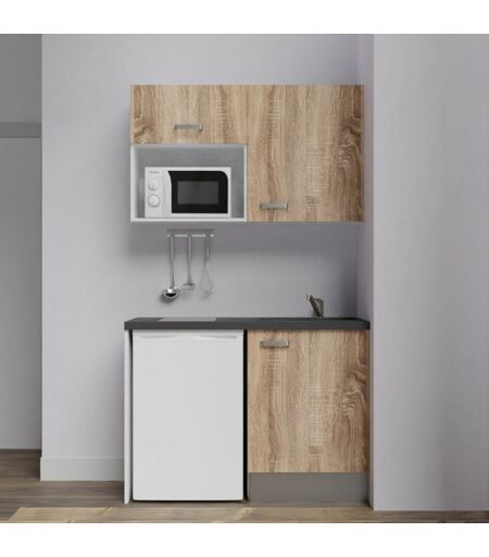 CUISIBANE Kitchenette K07L-PT - 120 cm avec plan de travail et évier, emplacements frigo et micro-ondes - Façade Bois - Plan Noir texturé - Evier Inox