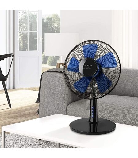 Couleur : noir et bleu,Oscillation «push & pull system»,Diamètre corbeille en maille : 40 cm,Puissance : 40 W,Débit d¿air : 34 m3/min,1250 tours/minute,3 vitesses de ventilation,5 hélices,Moteur AC,Poignée de transport,Grille de protection démontable pour un nettoyage facile,Inclinaison réglable,Dim produit (LHP) : 36 x 50 x 28 cm ,Poids net : 2,2 Kg ...