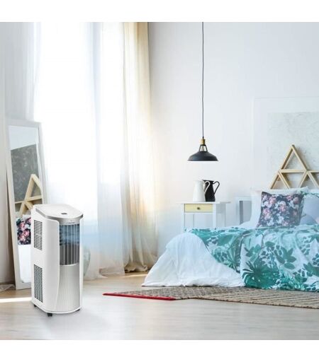 Climatiseur mobile PAC 2010 E de classe énergétique A à capacité de refroidissement maximale de 2,1 kW (7200 BTU) pour 26 m²/65 m³ max.Parfait pour climatiser, déshumidifier et ventiler.Le climatiseur PAC 2010 E est un vrai miracle d'ingéniosité. Très compact, il se range facilement par ex. dans un placard. Sa puissance frigorifique de 2,1 kW max. permet de climatiser agréablement les pièces de 65 m³ max.En plus de sa fonction de climatisation, le PAC 2010 E est doté d'une fonction de ventilation et de déshumidification pour plus de bien-être au coeur de l'été. La chaleur est évacuée hors de la pièce par le biais d'une gaine flexible qu'il est nécessaire de faire passer par une porte ou une fenêtre qu'on laisse entr'ouverte. Cette ouverture peut être calfeutrée à l'aide d'un accessoire pour climatiseur de type AirLock.Grâce à ses roulettes, il est facile de le changer de pièce au besoin. Toujours côté pratique, le rangement de câble intégré au dos de l'appareil évite que le fil traîne par terre lors du transport et une fois rangé.Les réglages s'effectuent sur le panneau de commande ou à l'aide de la télécommande fournie. Pour ranger cette dernière, un emplacement est intégré sur le dessus du climatiseur.Le climatiseur PAC 2010 E est en outre équipé d'une minuterie, d'un mode nuit, d'un filtre à air facile à nettoyer et d'une sortie d'air à réglage variable. ...