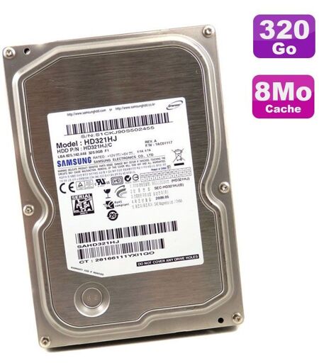 Marque : SAMSUNG Electronics Modèle : HD321HJ Interface : SATA Format de Disque : 3" 1/2 Capacité : 320 Go Vitesse de rotation : 7200 RPM Taille du cache : 8 Mo Produit de seconde main testé. ...