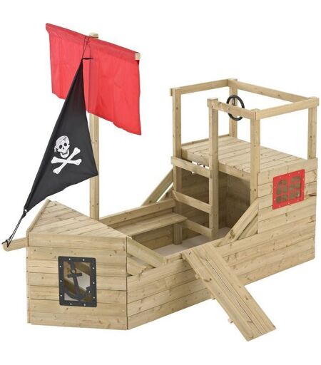 Description générale Cette cabane en bois d'épicéa traité sous pression est conçue pour les enfants à partir de 3 ans. Avec ses dimensions généreuses et son design attrayant, elle est idéale pour stimuler l'imagination et le jeu en extérieur. Spécifications techniques Coloris : Naturel Matériau principal : Bois d'épicéa (FSC) Matériaux secondaires : Plastique Hauteur : 206 cm Longueur : 272 cm Profondeur : 104 cm Encombrement au sol : 272 x 171 cm Garde-corps arrière (Hauteur) : 140 cm Plateforme (Hauteur) : 68 cm à l'avant 88 cm à l'arrière Age préconisé : À partir de 3 ans Composition : Cabane + voile rouge + drapeau pirate + volant Garantie : 5 ans contre la pourriture du bois Compatibilité et accessoires Livré en kit avec toutes les pièces nécessaires au montage Pièces pré-forées pour faciliter l'assemblage Installation À installer directement sur le gazon ou écorce de bois Montage estimé à 5 heures avec 2 adultes Utilisation Cette cabane est parfaite pour le jeu en plein air, ...