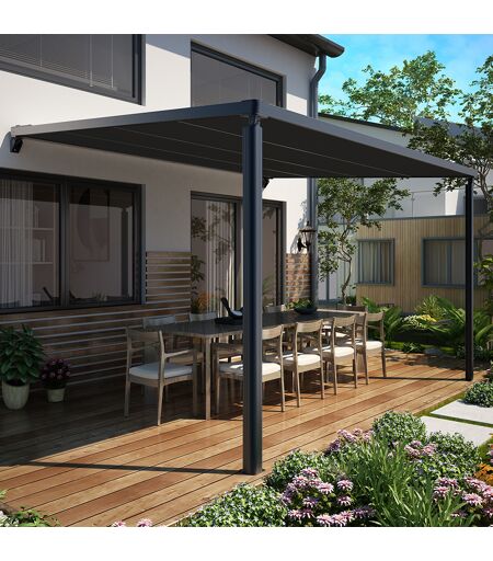 SUNNY INCH ® Pergola adossée aluminium à toile rétractable électrique avec LEDS - 4 x 3 m - Gris anthracite
