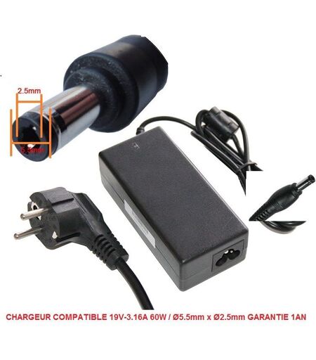 CHARGEUR ALIMENTATION COMPATIBLE POUR FUJITSU-SIEMENS ASUS ACER DELL PACKARD BELL HP COMPAQ IBM NEC 19V-3.16A 60W / Ø5.5mm x Ø2.5mm GARANTIE 1 AN