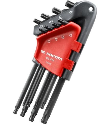 Clés mâles coudées TORX en étui FACOM Conformes aux spécifications Torx® et Resistorx® Les clés mâles sont présentées dans un étui compact à volet rabattable permettant une sélection rapide de la dimension souhaitée Tailles : T10 - T15 - T20 -T25 - T27 - T30 - T40 - T45 ...