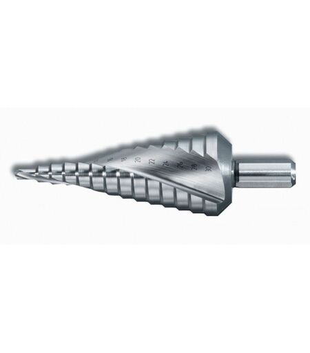 foret a étages hss de 4 à 30 mm pour percer l'acier, l'alu, le laiton, le plastique, le bois épaisseur de perçage totale : 4 mm maximum queue cylindrique de 10 mm pour percer plusieurs diamètres avec 1 seul outil en acier hss perçage de 4-6-8-10-12-14-16-18-20-22-24-26-30 mm ...