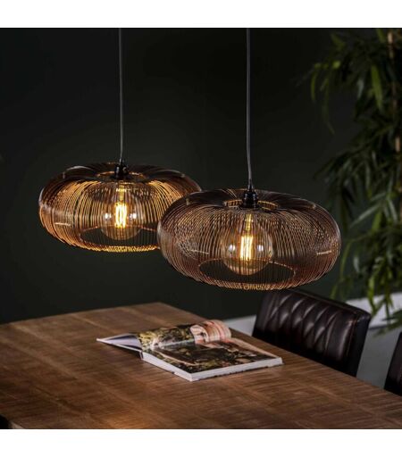 Cette suspension 2 lampes en métal noir apportera une touche élégante et chic à vos espaces de vie. Son faible poids permet une fixation en hauteur confortable et son socle en métal assure un bon point d'encrage pour la structure. Sa coloration en noire vieillie et dorée lui attribue un ton industriel très apaisant et chaleureux . Ses dimensions parfaites vous permettent de créer un décor unique sans pour autant occuper trop d'espace dans votre pièce. Le diamètre moyen de ses abat-jours assure une bonne filtration de la lumière et la protection des yeux. Cette lampe est parfaite pour un intérieur de type moderne . Couleur : noir vieilli et doré Matière : métal Dimensions (Lxlxh) : 102 x 43 x 150 cm Diamètre des abats-jour : 43 cm Dimensions de la fixation au plafond : 71 x 8 x 4 cm Allumage interrupteur mural (branchement électrique existant). Ampoule recommandée : ampoule LED à filament globe diamètre 9,5 - Type E27. Ampoule non incluse. Les abat-jour sont réglables en hauteur ...