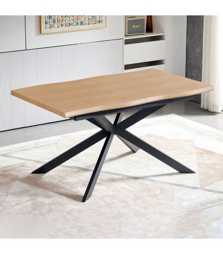 Optez pour cette table à manger extensible pieds en métal noir VENTER pour le relooking de votre chez soi. Elle fera une jolie décoration avec des chaises repas de style moderne ou contemporain , et est propice pour un usage quotidien et en famille. La surface rectangulaire dévoile une couleur naturelle , où la finition lisse est protégée contre les rayures. Son piètement est tout à fait robuste avec ses piliers concourants formant une étoile en dessous du plateau. Pourvue d'un système d'allonge papillon , cette table à manger permet une utilisation confortable pour les occasions festives. Le plateau est issu d'un mélange de panneaux de particules et de la mélamine, tandis que les pieds sont en métal . Couleur : naturel et noir Matière : plateau en mélamine et panneaux de particules d'épaisseur 36 mm avec veinage et finition anti-rayures et pieds en métal thermosoudés Dimensions hors-tout (Lxlxh) : 180-240 x 90 x 75 cm Dimensions de l'allonge (Lxl) : 60 x 90 cm Pour un côté pratique, ...