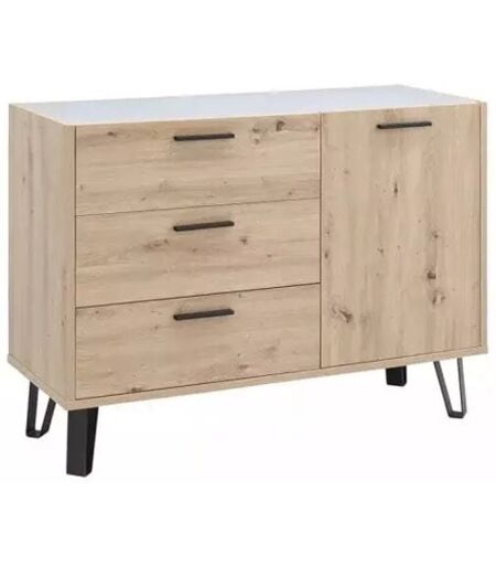 Découvrez la commode MILOS. Au look tendance, cette commode composée de 1 porte et 3 tiroirs vous offrira une solution de rangement optimale. L'alliance de son revêtement décors chêne clair, du gris laqué ultra brillant et des piétements en métal noir mat fait de cette commode un meuble moderne pour la chambre, le dressing ou le salon. Elle trouvera naturellement sa place dans une décoration à l'esprit nature et cocooning. Pour une ambiance chaleureuse et élégante, succombez à la collection MILOS. Avec son revêtement au décor chêne clair, cette gamme de mobilier sera idéale pour une décoration à dominante naturelle. On aime la légère touche de gris clair laqué haute brillance, couplée aux piétements en métal noir mat qui ajoutent une touche de modernité à l'ensemble. Un mobilier de qualité de fabrication européenne. Caractéristiques : PRODUIT : Commode 1 porte / 3 tiroirs MILOS. COULEUR : Bois. COMPOSITION : Panneaux de particules mélaminés FSC. Le FSC® (Forest Stewardship Council®) ...