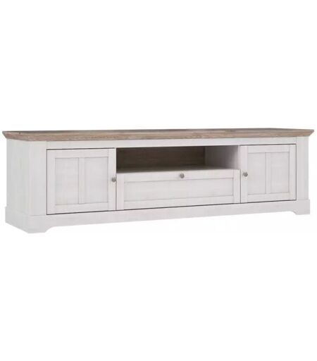 DESCRIPTION GÉNÉRALE Découvrez le meuble TV 205 cm ANGELE. Un élégant meuble TV au style classique chic qui ajoutera une touche campagnarde à votre intérieur. Dans votre salon, le meuble TV ANGELE au décor chêne blanchi vous apportera un petit espace de rangement. Ses 2 portes et son tiroir sont équipés du système 'soft close' pour une fermeture en douceur. Sa niche et ses passe câbles vous permettront de brancher consoles, lecteur DVD et Blu-Ray. Son plateau marron aux bords biseautés apporte finesse et raffinement. Les boutons de porte en métal gris ajoutent de l'élégance au meuble. SPÉCIFICATIONS TECHNIQUES Meuble TV 205 cm ANGELE. COULEUR : Bois blanchi / Bois clair. 2 portes (2 tablettes amovibles et réglables en hauteur) / 1 tiroir / 1 niche / 3 passe câbles. COMPOSITION : Structure panneaux de particules 15 et 18 mm / Plateau supérieur 22 mm d'épaisseur (4.7 cm sur les bords) / Panneaux arrière HDF 2 mm. FINITIONS : Décor bois blanchi / Plateau décor chêne clair. DETAILS : ...