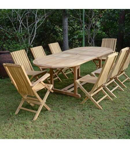 Salon de jardin en Teck massif Fuji - Table ovale Vérone extensible de 160 / 240 x 90 cm + 6 chaises et 2 fauteuils Karimun Réalisation soignée et design intemporel pour le salon de jardin en teck massif Fuji qui pourra accueillir 8 à 10 convives pour des repas au jardin. Le grand plateau modulable de la table Vérone grâce à ses 2 rallonges papillon, permet facilement d'obtenir une table de 1.60 m, 2.00 m ou 2.40 m selon le nombre d'invités. Les 6 chaises et les 2 fauteuils Karimmun allient élégance et confort avec un haut dossier ergonomique et une belle ligne épurée. Pratiques, les assises se plient pour un gain de place lors du rangement en fin de saison. Comme tout notre mobilier de jardin Teck'Attitude, le salon de jardin Fuji est réalisé dans un teck massif certifié FSC® ce qui lui garanti une longévité au fil des saisons. Il a bénéficié d'un assemblage dans les règles de l'ébénisterie avec tenons et mortaises suivi d'un ponçage méticuleux qui préserve sa belle couleur ...