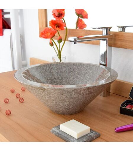 Vasque de salle de bain à poser en marbre gris Koni Avec sa jolie ligne évasée et sa finition lisse à l'intérieur et à l'extérieur, la vasque en marbre gris Koni apportera une note de raffinement et de modernité à votre salle de bain. Avec son diamètre de 40 cm, elle pourra équiper tout les meubles ou plan vasque, en solo ou en duo, selon la largeur de ces derniers. Chaque vasque est unique. Le marbre est une pierre naturelle qui est reconnaissable par ses aspérités et ses nuances. Nos vasques sont faites de manière artisanale, il est donc possible d'avoir une légère différence au niveau de la couleur et du veinage de chaque vasque. Vasque en marbre gris Finition polie extérieur et intérieur Dimensions : ø 40 x h 15 cm Percement aux normes Européennes Livrée sans bonde et sans robinet. Pour le vidage, nous vous conseillons d'utiliser une bonde à écoulement libre. La vasque Koni est également disponible en marbre noir et crème. Pour le transport, la vasque est protégée avec du ...