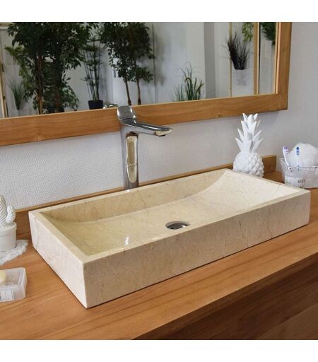 DESCRIPTION GÉNÉRALE Vasque à poser en marbre crème Boreal, avec un veinage délicat, idéale pour une salle de bain contemporaine et raffinée. Sa longueur généreuse et ses pentes d'écoulement originales en font un choix élégant. Chaque vasque est unique, avec des nuances et aspérités propres au marbre naturel. SPÉCIFICATIONS TECHNIQUES Dimensions : L 70 x l 35 x h 10 cm Livrée sans bonde et sans robinet Percement conforme aux normes Européennes Recommandation : utiliser une bonde à écoulement libre Protection maximale pour le transport AUTRES INFORMATIONS Attention : poids lourd, ne pas laisser tomber. ...