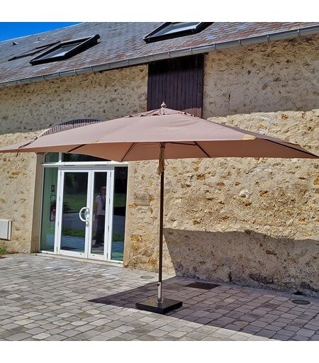 Parasol taupe en bois 400x300 cm Pegasia Ce grand parasol en bois de 3 x 4 mètres est idéal pour ombrager les grandes tablées. Parasol avec mât central en bois et toile en polyester résistante à l'eau à choisir dans un coloris assorti à votre mobilier de jardin. Nous vous recommandons de replier le parasol en cas de vent fort. Mobilier pour l'extérieur haut de gamme Mât et 8 baleines en bois Visserie en acier inoxydable Doubles coutures de la toile et pointes renforcées Soufflet de ventilation situé au sommet de la toile pour apporter moins de résistance au vent Système d'ouverture par corde et poulie Toile amovible polyester traitée déperlante taupe grammage 200 gr/m2 Livré sans pied Diamètre du mât : 48 mm - Baleine : 17 x 28 mm Autres coloris de la toile disponibles : gris, écru et noir A compléter avec une base de parasol à roulettes pour lester et déplacer aisément votre parasol. Attention : à l'ouverture, assurez-vous que la corde ne soit pas emmêlée. ...