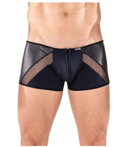 J'incarne la tentation. Je suis votre boxer Stunt noir de la marque Look Me ! Curieux mariage de similicuir noir et de maille transparente à pois, je suis aisément capable d'éveiller les passions, que ce soient les vôtres ou celles de votre partenaire. De plus, je suis doté d'une arme de séduction supplémentaire ! En effet, mes fermetures éclair à l'avant comme à l'arrière vous permettront de jouer espièglement avec la patience de votre moitié... Composition : 80% Polyamide, 20% Élasthanne ...