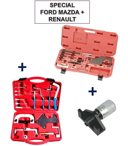 Coffrets de calage FORD/MAZDA : Ce kit de pige calage distribution pour bloquer les arbre à cames, vilebrequin etc... lors du changement de la courroie de distribution pour tous les moteurs diesel et essence de Ford. Moteurs essence : Zetec SE (Fiesta à partir 1996, Focus à partir de 1998, Puma à partir de 1997). Tous les moteurs 1.25 / 2.0 (1995-1998). Tous les moteurs 1.6 16V / 1.8 16V / 2.0 16V (1991-1998). Moteurs diesel : Tous les moteurs 1.6 / 1.8 / 1.9 (à partir 1997). Tous les moteurs 1.8 D/TD/TDCi. Ne convient pas pour moteurs 1.6 Ti-VCT. + RENAULT : Coffret complet d'outils de calage, de distribution pour la plupart des moteurs essence et diesel des véhicules du groupe Renault. Cet ensemble d'outils fabriqués en acier trempé pour une durabilité renforcée est conçu pour une multitude de travaux différents décrits ci-dessous.+ Tensiomètre de courroie de distribution: Outil pour le réglage de la tension de la courroie de distribution. FORD/MAZDA : Caractéristiques Techniques: ...