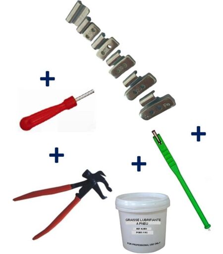 Kit complet composé de :150 Plombs Masse d’Equilibrage a Frapper 5 à 30gr pour jantes alu,+ 1 Tire Valve,+ 1 Démonte Obus,+ 1 Pot de Graisse Pneu de 1 kg,+ 1 Pince Marteau pour Plombs Masses d'Equilibrage de Roue clipsée. 1 Lot de 150 plombs à frapper Acier Zinc à frapper avec 25 plombs de chaque poids de : 5 g – 10 g – 15 g – 20 G – 25 g – 30 g pour jantes en alu.1 Démonte obus de valve de type tournevis démonte obus de valve standards auto - moto etc... Outil permettant de démonter les obus de valve. Tige en acier robuste, résistant à la corrosion et poignée en plastique résistant. Dimensions : 90 mm. Diamètre de la tige : 4 mm. Poids: 50 gr. 1 Outil tire-valve en résine pour le démontage des valves standards auto - moto etc... Longueur 29 cm. Embout articulé avec blocage à bille. Embout démonte obus intégré en bout de manche. 1 Pot de graisse: Conditionnement : seau de 1 KG. Pouvoir lubrifiant supérieur. Simple et pratique à utiliser (ne coule pas). Séchage rapide : évite la ...