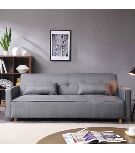 Design unique et confort XXL pour le Copenhague, canape scandinave convertible 3 places gris aux formes genereuses. Un confort exceptionnel, grâce à une qualite de mousse et de plumes remarquable. Ses 2 petits coussins rectangulaires peuvent servir de cale-reins, d'accoudoir ou d'oreiller en position detente. Caracteristiques techniques : Nombre de places : 3 Couleur : gris Revêtement : tissu Piètement : bois Structure : bois massif + panneaux de particules Dossier : mousse recyclee de 50 kg/m3 et suspensions ressorts zig zag Coussins : Ouate Nettoyage : facile avec un chiffon humide Dimensions : Total (l x P x h) : 213 x 89 x 79 cm Dimension des accoudoirs : 87 x 50 x 10cm Dimension des oreillers : 68 x 28 cm Dimension du lit : 213 x 111 x 40 cm Hauteur pied : 6 cm Diamètre pied : 6 cm Hauteur assise : 40 cm Profondeur assise : 59 cm Conditionnement : Le produit est conditionne dans un colis de 194 x 112 x 33 cm / 50kg. Montage facile une notice est fournie. ...