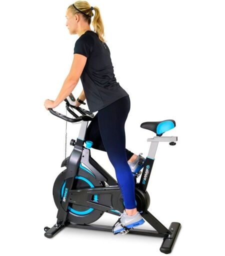 Le SPINNER de la marque SPARRAW est un vélo de spinning doté d'un système de résistance manuelle à patin feutrine et d'une roue d'inertie de 6 kg pour un pédalage doux, fluide et efficace. Le spinning est une activité de cardio-training, ce type d'entraînement permet de brûler des calories de manière efficace, de renforcer le muscle cardiaque et d'améliorer le travail respiratoire. Côté calories : à la fin d'une séance de RPM de 1 heure, vous pouvez être fière d'avoir éliminé environ 900 calories ! Pour un suivi efficace de vos séances, ce vélo intègre des capteurs de pouls tactiles sur le guidon et un écran LCD (fonctionne avec des piles AAA non fournies) affichant 6 fonctions principales : le temps écoulé, le nombre de kilomètres parcourus et le nombre de calories dépensées depuis le début de votre séance mais aussi la distance totale accumulée parcourue puis la vitesse et la fréquence cardiaque. Pour une sécurité optimale, ce vélo dispose d'un arrêt d'urgence, en appuyant tout simplement sur la molette de résistance vous pouvez arrêter la transmission de façon immédiate. Son cadre est robuste et suffisamment lourd 24 kg ce qui lui apporte une très bonne stabilité, notamment pour rouler en danseuse. Totalement ergonomique et confortable, le ULTRA SPRINTER dispose d'une selle réglable (verticalement et horizontalement), d'un guidon réglable en hauteur et de sangles réglables au niveau des pédales pour un maintien optimal lors de son utilisation. Le large choix de ces réglages permettent d'adopter une position adaptée à la morphologie de l'utilisateur et ainsi d'éviter toute erreur de posture. Sa structure assez compacte et ses roulettes frontales permettent de le déplacer facilement d'une pièce à une autre. Idéal pour un objectif de remise en forme, perte de poids ou encore de préparation physique. Pratiquer ce sport permet d'améliorer l'endurance cardiovasculaire mais aussi le renforcement musculaire. Défoulez-vous et profitez d'un entraînement de qualité avec les appareils Sparraw ! Livré prémonté à 80%. En 30 minutes votre nouvel appareil sera sur pied et vous aussi ! CARACTÉRISTIQUES TECHNIQUES : Poids max utilisateur : 110 kg Poids recommandé pour une utilisation optimale : 90 kg Roue d'inertie de 6 Kg Dimension produit : 104 x 48 x 115 cm Selle réglable en hauteur : min 80 cm et max 92 cm Guidon réglable en hauteur : min 108 cm et max 115 cm Poids du Vélo : 24 Kg Matière : Acier et ABS CONSEILS D'UTILISATION : Placez l'appareil sur une surface plane. Et pour une installation optimale, il est recommandé de placer un tapis de sol sous l'appareil. ...