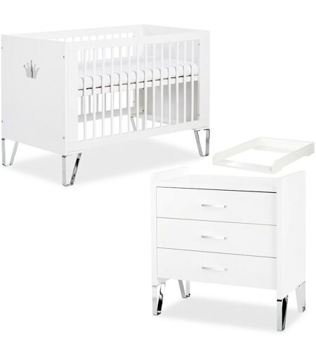 Ensemble lit enfant et commode à langer avec plateau amovible. Dès la naissance. CARACTÉRISTIQUES : Cet ensemble chambre d'enfant réunit le bois et le métal. Il est composé d'un lit 120 x 60 cm évolutif et d'une commode à langer. Lit BLANKA Ce lit évolutif à barreaux convient à votre bébé dès la naissance. Son sommier, réglable sur 3 niveaux, permet d'adapter la hauteur selon l'âge de l'enfant. Dès que l'enfant devient autonome, 3 barreaux peuvent être enlevés. L'enfant peut ainsi entrer et sortir librement de son lit. Le miroir, en forme de couronne, sur un côté ajoute une touche de fantaisie à ce lit. Fabriqué en pin, MDF et aggloméré. Commode BLANKA Le plan à langer de cette commode est amovible. Les 3 tiroirs, à poignées en métal chromé, sont installés sur des rails coulissants. Fabriqué en MDF. Matelas non inclus. Pieds en métal chromé. Peinture à l'eau. Fabriqué en Europe. DIMENSIONS ET POIDS : Dimensions intérieures du lit : L 120 x l 60 cm. Dimensions extérieures du lit : L ...