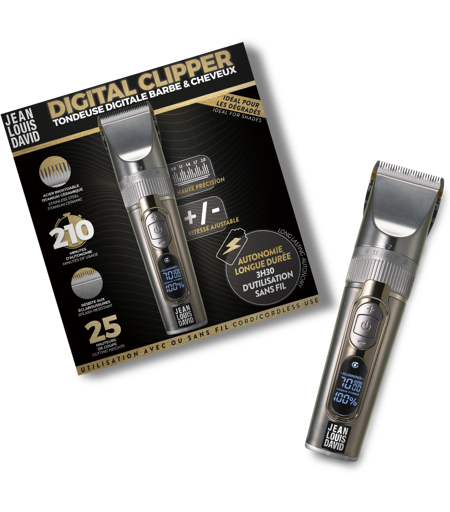 25 HAUTEURS DE COUPE 0,8 A 12 MM SONT DISPONIBLES POUR CONVENIR À TOUTES VOS ENVIES. PRÉCISE ET FACILE D’UTILISATION, CETTE TONDEUSE JEAN LOUIS DAVID EST FOURNIE AVEC DEUX PEIGNES DE GUIDAGE POUR FACILITER LE TRAVAIL DES DÉGRADÉS ET DES CONTOURS DES OREILLES. SA BATTERIE LITHIUM-ION SE RECHARGE COMPLÈTEMENT EN 120 MINUTES POUR UNE UTILISATION SANS FIL DE 210 MINUTES ET PEUT ÊTRE UTILISÉE ÉGALEMENT SUR SECTEUR. POUR UN PLUS GRAND CONFORT D'UTILISATION, SES LAMES EN INOX ET CÉRAMIQUE PEUVENT ÊTRE RETIRÉES ET NETTOYÉES À L'EAU. ...