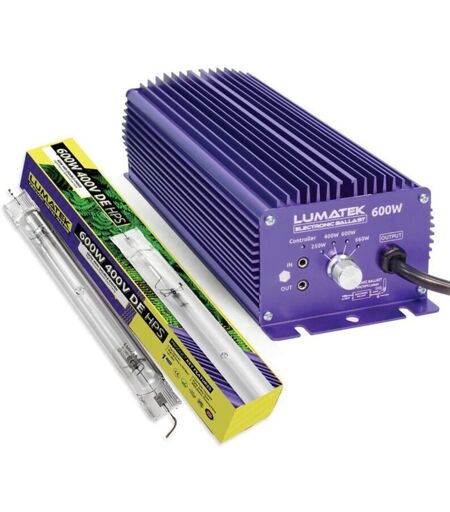Lumatek - Kit Pro ballast dimmable + ampoule E40 - 600W - 400V Ce kit comprend une ampoule HPS 600W 400V à double culot , conçue pour une croissance optimale des plantes. Dotée d'un démarrage par impulsion, elle est compatible avec les ballasts électroniques Lumatek. Grâce à son tube à arc en céramique de haute qualité et à son mélange de gaz horticole spécifique, elle offre une sortie spectrale idéale pour favoriser une croissance saine. Les lampes HPS à double culot sont plus stables que les lampes traditionnelles, permettant une intensité lumineuse accrue de 10 % et un meilleur rendement PAR/PPF. Cette intensité lumineuse supérieure permet également de positionner la lampe plus loin de la canopée des plantes, améliorant ainsi l'uniformité de la lumière. Le kit est aussi composé d'un ballast contrôlable Lumatek Ultimate Pro 600W, qui offre puissance et contrôle pour une croissance optimale des plantes. Spécialement conçu pour les cultivateurs amateurs, il alimente les lampes ...