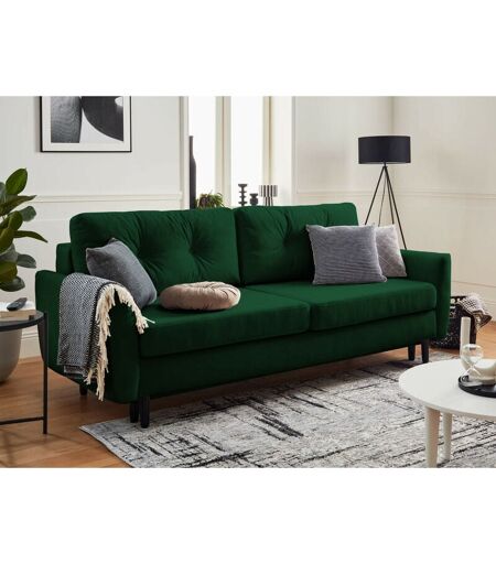 Livraison sur RDV devant chez vous ou en bas de votre immeuble. Deux à trois jours après l'expédition, vous recevez un SMS pour vous permettre de planifier la livraison au jour qui vous convient, du lundi au vendredi de 8h à 17h30. Description technique Nombre de places canapé : 3 Fabrication : Europe Convertible : oui (conçu pour un couchage d'appoint) Coffre de rangement : sous le canapé Structure composée de bois massif et panneaux de particules Suspension : sangles élastiques Garnissage des assises et dossiers : mousse polyuréthane de densité 30Kg/m3 Garnissage des coussins de dossier : flocons de mousse Revêtement en tissu 100% polyester velours Pieds : bois naturel A assembler : en quelques minutes, notice fournie Deux coussins de dossier inclus dans le colis Dimensions du canapé Dimensions hors tout (LxHxP) : 220x90x100 cm Largeur : 220 cm Hauteur : 90 cm Profondeur du canapé : 100 cm Taille du couchage : 145x190x14 cm Largeur d’assise : 190 cm Hauteur d'assise : 48 cm ...