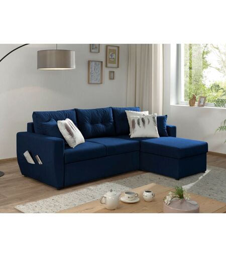 Livraison sur RDV devant chez vous ou en bas de votre immeuble. Deux à trois jours après l'expédition, vous recevez un SMS pour vous permettre de planifier la livraison au jour qui vous convient, du lundi au vendredi de 8h à 17h30. Description technique Nombre de places : 4 Convertible : Oui Fabrication : Europe Coffre de rangement : sous la méridienne Position de l’angle : canapé réversible, vous positionnez votre angle à gauche ou à droite selon votre envie. Structure composée de bois massif et panneaux de particules Assises garnies de mousse polyuréthane de densité 28Kg/m3 recouverte de ouate 150g/m2 Dossiers garnis de flocons de mousse Revêtement : velours 100% polyester Poche sur accoudoir : oui Détail des matières : Assise : Mousse polyuréthane de densité 28Kg/m3 + ouate 150g/m2 - Dossier : Flocons de mousse - Structure composée de bois massif et panneaux de particules - Revêtement en velours 100 % polyester Poids maximum supporté : 360 kg A assembler : en quelques minutes, ...