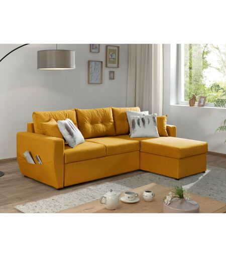 DESCRIPTION GÉNÉRALE Le canapé d’angle Astoria, en velours au style contemporain, s'adapte à différentes décorations d’intérieurs grâce à ses lignes épurées. Il offre une assise confortable et des coussins de dossiers fermes. Proposé en plusieurs coloris, il saura s’intégrer dans votre pièce à vivre. Il dispose d'une poche sur l’accoudoir pour ranger télécommandes et magazines, d'une fonction convertible pour accueillir vos proches, et d'un coffre de rangement sous la méridienne. SPÉCIFICATIONS TECHNIQUES Nombre de places : 4 Convertible : Oui Fabrication : Europe Coffre de rangement : sous la méridienne Position de l’angle : canapé réversible Structure : bois massif et panneaux de particules Assises : mousse polyuréthane de densité 28Kg/m3 recouverte de ouate 150g/m2 Dossiers : flocons de mousse Revêtement : velours 100% polyester Poche sur accoudoir : oui Poids maximum supporté : 360 kg A assembler : en quelques minutes, notice fournie Dimensions hors tout : L226xH85xP146 cm ...