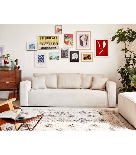 Description générale Découvrez le canapé Topaze 3 places, une pièce maîtresse pour votre salon. Son style boho, ses lignes arrondies et son revêtement en velours côtelé en font un choix idéal pour allier confort et esthétique. Disponible en plusieurs coloris, il s'intègre facilement à tous les intérieurs et offre une fonction convertible pratique. Spécifications techniques Origine : Europe Garantie : 2 ans Type de canapé : Canapé convertible Nombre de places : 3 Fonction convertible : Oui Type de convertible : Dossier rabattable Couchage : Occasionnel Rangements : Oui Équipement : Coffre de rangement Matière de la structure : Bois massif et panneaux de particules Matière du canapé : Velours côtelé Densité de l'assise : 28 kg/m3 Poids : 72 kg Style : Contemporain Montage : 30 minutes Nombre de colis : 2 Dimensions du produit Hauteur : 85 cm Largeur : 226 cm Profondeur : 83 cm Hauteur d'assise : 37 cm Largeur d'assise : 190 cm Profondeur d'assise : 49 cm Largeur du couchage : 136 cm ...