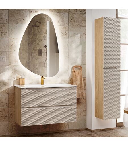 Ensemble meuble simple vasque encastrée 90cm et colonne Elora Beige et bois Collection : Elora Fabrication : Fabrication Européenne Matériaux : Facade en panneaux MDF 16 mm Corps en panneaux mélaminé 16 mm 70% de Bois certifié FSC issu d'une gestion forestière durable Vasque en céramique Couleur : Beige et bois façon chêne huilé Vasque blanche La couleur sur la photo peut varier en fonction des réglages de votre écran (contraste, luminosité) Caractéristiques : Meuble vasque : Meuble à suspendre 2 tiroirs Vasque à encastrer Incluse Système de fermeture silencieuse Fixations murales : vis et chevilles non incluses Il est recommandé d'adapter vos fixations en fonction de votre support Ce meuble existe en 4 tailles : 60 cm, 80 cm, 90 cm et 120 cm Cette collection existe en 2 couleurs : Beige et Noir Caractéristiques : Colonne : Meuble à suspendre 2 portes (ouverture réversible gauche ou droite) 3 étagères Système de fermeture silencieuse Fixations murales : vis et chevilles non incluses ...