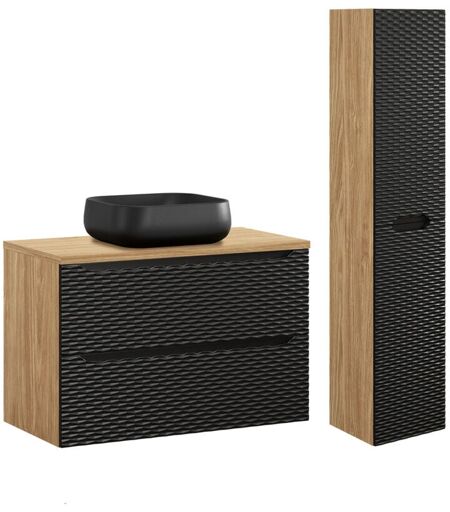 Ensemble meuble simple vasque 90cm et colonne Elora Noir et bois Collection : Elora Fabrication : Fabrication Européenne Matériaux : Facade en panneaux MDF 16 mm Corps en panneaux mélaminé 16 mm Plan de toilette en panneau MDF 25 mm 70% de Bois certifié FSC issu d'une gestion forestière durable Vasque en céramique Couleur : Noir et bois façon chêne huilé Vasque noire mate La couleur sur la photo peut varier en fonction des réglages de votre écran (contraste, luminosité) Caractéristiques : Meuble vasque : Meuble à suspendre 2 tiroirs Plan de toilette Inclus Vasque à poser Incluse Système de fermeture silencieuse Fixations murales : vis et chevilles non incluses Il est recommandé d'adapter vos fixations en fonction de votre support Ce meuble existe en 4 tailles : 60 cm, 80 cm, 90 cm et 120 cm Cette collection existe en 2 couleurs : Beige et Noir Caractéristiques : Colonne : Meuble à suspendre 2 portes (ouverture réversible gauche ou droite) 3 étagères Système de fermeture silencieuse ...