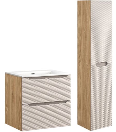 Ensemble meuble simple vasque encastrée 60cm et colonne Elora Beige et bois Collection : Elora Fabrication : Fabrication Européenne Matériaux : Facade en panneaux MDF 16 mm Corps en panneaux mélaminé 16 mm 70% de Bois certifié FSC issu d'une gestion forestière durable Vasque en céramique Couleur : Beige et bois façon chêne huilé Vasque blanche La couleur sur la photo peut varier en fonction des réglages de votre écran (contraste, luminosité) Caractéristiques : Meuble vasque : Meuble à suspendre 2 tiroirs Vasque à encastrer Incluse Système de fermeture silencieuse Fixations murales : vis et chevilles non incluses Il est recommandé d'adapter vos fixations en fonction de votre support Ce meuble existe en 4 tailles : 60 cm, 80 cm, 90 cm et 120 cm Cette collection existe en 2 couleurs : Beige et Noir Caractéristiques : Colonne : Meuble à suspendre 2 portes (ouverture réversible gauche ou droite) 3 étagères Système de fermeture silencieuse Fixations murales : vis et chevilles non incluses ...