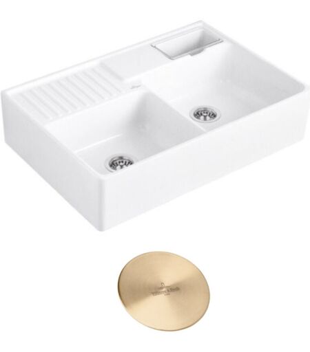 Villeroy & Boch Villeroy&boch - Evier timbre d'office villeroy et boch Tradition 2 bacs 89,5 x 63 céramique vidage auto blanc + Cache bonde or