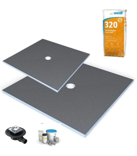 Wedi - Receveur de douche à carreler 100 x 100 Fundo Primo écoulement centrée + bonde horizontale + kit d'étanchéité + colle 320