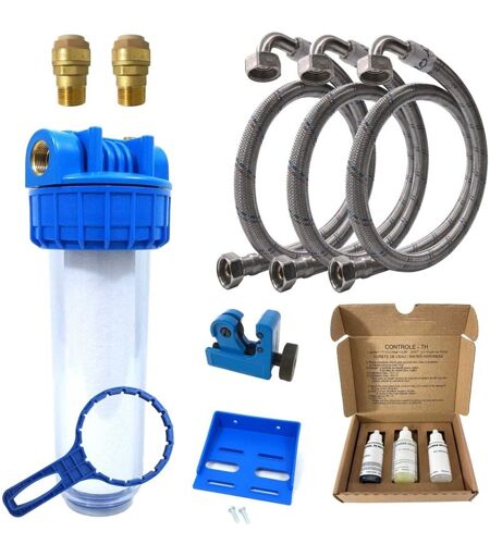 Kit d'Installation Complet pour Adoucisseur d'Eau sur Tuyau Cuivre / PER 3/4" (20/27) Notre Kit d'Installation pour Adoucisseur d'Eau Raccord Femelle - Femelle Coudé 3/4" (20/27) Cuivre et PER est la solution idéale pour la mise en service de votre adoucisseur d'eau . Avec notre kit complet, l'installation est simple, vous permettant de profiter rapidement des avantages d'une eau adoucie de qualité. Composition du Kit d'Installation pour Adoucisseur d'Eau Raccord F-FC 3/4" (20/27) : Valisette de Test de Dureté. Porte-Filtre 9"3/4 avec équerre de fixation et Filtre anti sédiments 20 microns. 3 Flexibles FF Coudés de longueur 100cm et diamètre 13mm (20/27 - 3/4"). 2 Raccords Rapides de 18 mm (20/27 - 3/4") pour assurer des connexions étanches et durables sur le tuyau cuivre. Mini Coupe Tube : Le coupe tube inclus dans le kit vous permet de réaliser des coupes précises et propres sur le tuyau cuivre ou PER, garantissant une installation professionnelle. Chez Adoucisseur d'Eau, nous ...