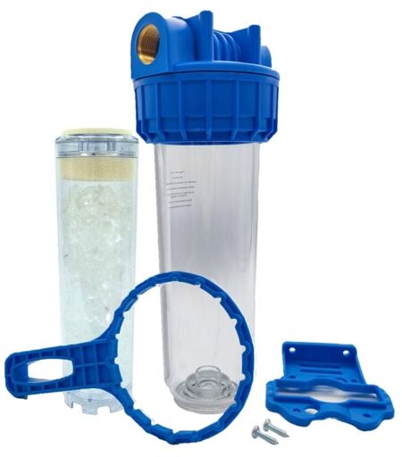 Porte filtre 9 pouces 3/4 AF27524 Filtre Anti Calcaire. A installer sur un réseau d' eau froide et a équiper de la cartouche aux cristaux de polyphosphates fournie pour empêcher la formation de tartre dans vos canalisations. Les avantages du porte filtres transparent Anti Tartre 9"3/4 : Installation rapide et montage + démontage facile. Purge par simple bouton poussoir Convient à tous types de filtration d'eau domestique. Bol du Porte-filtre transparent pour voir à travers et savoir précisément quand changer la cartouche. Fabriqué en France et certifié ACS . Système de filtration simple - raccord 26/34 - pour le traitement du calcaire sur le réseau d'eau L'ensemble est composé de 3 pièces avec une bague de serrage tournante qui assure une étanchéité optimale entre le bol transparent et la tête. Ce porte filtre 9"3/4 est idéal pour traiter les impuretés, sédiments, chlore, mauvais goût ou odeurs désagréables et même le calcaire présents dans l'eau. (Toutes les cartouches compatibles ...