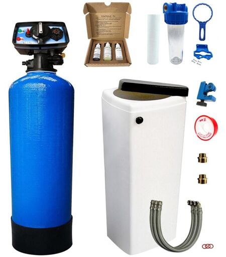 Adoucisseur d'eau bi bloc complet 16L Fleck 5600 prêt à l'emploi Adoucisseur d'eau bi-bloc 16 litres de résine échangeuse d'ions et équipé d'une vanne Fleck 5600 MC mécanique chronométrique permettant de supprimer les traces de calcaire sur votre installation. Idéal pour installation sous plan de travail ou pour alimenter une machine dans une cuisine industrielle par exemple : four a vapeur, lave vaiselle... Les avantages de l'adoucisseur d'eau BVC0165 : Élimine efficacement le calcaire et vous facilite les tâches ménagères Prêt à l'emploi et livré complet avec accessoires Installation simple, rapide et Certifié ACS Assemblé en France par nos équipes Facilité de programmation , d'utilisation et d'entretien Garantie étendue : 7 ans avec notre kit d'entretien annuel La vanne Fleck 5600 MC fabriquée par PENTAIR, leader mondial, est d'une grande fiabilité de par sa robustesse et sa simplicité. La régénération est lancée lorsque le temps réglé est écoulé. En fonction de l'application, du ...
