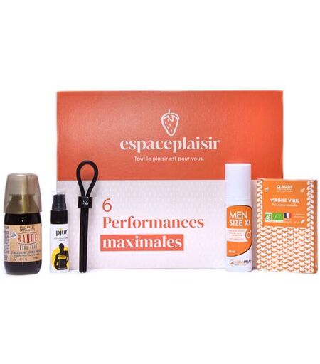 Je suis le coffret Performances maximales N°6 d'espaceplaisir, idéal pour les hommes qui souhaitent augmenter leurs performances sexuelles. Conçu par une équipe d'experts, je vous aiderai à améliorer la qualité de vos érections, prolonger les rapports sexuels et booster votre libido. C'est un coffret parfait pour offrir et faire plaisir car il est exclusif à espaceplaisir avec une boîte aimantée Deluxe. Utilisez son contenu en solo ou avec votre partenaire pour des soirées assurément torrides ! Le coffret Performances maximales N°6 contient : * Crème développante MenSizeXL 60 ml de Labophyto (https://www.espaceplaisir.fr/labophyto-mensize-xl-creme.html) Une crème développante pour améliorer la qualité de l'érection. Grâce à sa composition riche en plantes, cette crème favorise la circulation sanguine dans le pénis et permet d'obtenir des érections plus imposantes et durables. * Spray retardant Superhero de pjur (https://www.espaceplaisir.fr/pjur-superhero-performance-spray.html) Ce spray améliore les performances sexuelles et aide à prolonger le plaisir ! Fabriqué sans lidocaïne ni benzocaïne, il aide à prévenir l'éjaculation précoce et a un effet rafraîchissant qui réduit l'hypersensibilité de la peau. * Cockring ajustable EDGE Maximum Control de Tracey Cox (https://www.espaceplaisir.fr/tracey-cox-edge-maximum-control-adjustable-stamina-ring.html) Un cockring entièrement réglable qui peut aider à améliorer et à prolonger les érections. C'est un lien coulissant en silicone avec une fermeture sécurisée pour un ajustement parfait. * Aphrodisiaque masculin Virgile Viril BIO de Claude Aphrodisiacs (https://www.espaceplaisir.fr/claude-aphrodisiacs-virgile-viril-bio-x10.html) Virgile Viril est un complément alimentaire à base de safran qui participe à augmenter l'érection chez l'homme. Formulé avec des plantes bio, il contribue à une circulation sanguine normale ainsi qu'au maintien de la force, des efforts physiques et de la performance. * Stimulant Bois Bandé Muira Puama 125 ml d'Eric Favre (https://www.espaceplaisir.fr/eric-favre-bois-bande-muira-puama-125-ml.html) Le Bois Bandé, ou Muira Puama, est une écorce naturelle reconnue depuis des décennies pour ses vertus aphrodisiaques. Cette formule liquide aide à stimuler l'énergie, le désir et l'érection pour donner un coup de boost quand vous en avez besoin. Le contenu du coffret est susceptible d'être modifié en cas de rupture temporaire d’un ou plusieurs produits. Pour que votre plaisir soit complet, espaceplaisir vous recommande d'utiliser un lubrifiant à base d'eau avec votre sextoy. Il est important de nettoyer votre sextoy avant et après chaque utilisation. ...