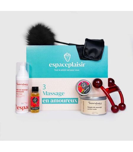 Je suis le coffret Massage en amoureux N°3 d’espaceplaisir, idéal pour tous les couples qui souhaitent offrir un cadeau d'exception à leur partenaire. Conçu par une équipe d'expert·e·s, il vous permettra de réaliser des massages variés, originaux et très sensuels. C'est un coffret parfait pour offrir et faire plaisir car il est exclusif à espaceplaisir avec une boîte aimantée Deluxe. Utilisez son contenu avec votre partenaire et rendez vos soirées en amoureux encore plus torrides ! Votre coffret Massage en amoureux N°3 contient : * Huile de massage chauffante gourmande menthe mojito d'Exsens (https://www.espaceplaisir.fr/huile-de-massage-chauffante-gourmande-menthe-mojito-exsens.html) Cette huile de massage gourmande avec effet chauffant a été créée pour apporter de nouvelles sensations et émotions aux jeux intimes. Sa délicieuse saveur fraîche et fruitée vous ouvrira l'appétit pour des moments érotiques à deux inoubliables. * Mousse de massage crépitante Tickle My Body fraise de Love to Love (https://www.espaceplaisir.fr/love-to-love-tickle-my-body-fraise.html) Frissonnez de plaisir avec cette mousse de massage unique en son genre. Appliquez-la sur le corps de votre partenaire et laissez-vous surprendre par une sensation de crépitement exquis. Une texture étonnante et rafraîchissante. * Bandeau soyeux Tease de Lovehoney (https://www.espaceplaisir.fr/lovehoney-silky-black-blindfold.html) Un bandeau fabriqué dans un tissu satiné doux et soyeux, qui procure une sensation agréable pendant toute la durée de vos jeux. Bordure en similicuir avec une armature métallique cachée qui garantit une obscurité totale pour le·a porteur·euse. * Plumeau noir de Bondage Boutique (https://www.espaceplaisir.fr/bondage-boutique-faux-feather-tickler.html) Un petit plumeau en plumes synthétiques pour effleurer la peau de votre amant·e. Il accompagne à la perfection vos jeux BDSM soft. Longueur totale de 20 cm pour un transport facile et un rangement discret. * Bougie de massage Oh! fraise de Lovehoney (https://www.espaceplaisir.fr/lovehoney-oh-strawberry-massage-candle.html) Une bougie de massage parfumée à la fraise pour des massages sensuels et fruités ! Appliquez l'huile sur le corps de votre partenaire et massez sa peau délicieusement parfumée. Contient 6 huiles essentielles pour un massage nourrissant. * Masseur corporel Oh! rouge de Lovehoney (https://www.espaceplaisir.fr/lovehoney-oh-sensual-body-massager.html) Un appareil de massage manuel pour augmenter les sensations lors des massages en couple. Il comporte 4 billes pour un massage précis et efficace. Sa poignée lisse et ergonomique facilite les mouvements amples et sensuels. * Huile de massage embrassable à la fraise Oh! 30 ml de Lovehoney (https://www.espaceplaisir.fr/lovehoney-oh-strawberry-kissable-massage-oil-30-ml.html) Une huile de massage embrassable et délicieusement parfumée pour des massages relaxants et des préliminaires sensuels. Infusée avec des huiles essentielles. Petit format pratique pour... ...