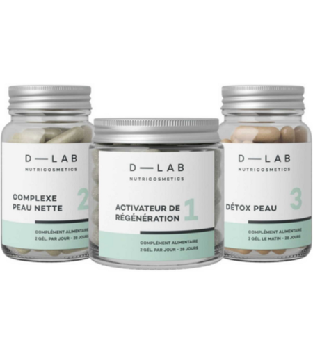 3Suisses : Un programme conçu pour prendre soin de la peau au quotidien Pour avoir une belle peau sans trop se reposer sur des soins cosmétiques, misez sur le Programme Peau Parfaite 1 Mois des laboratoires D-Lab. Ce set comprend le nécessaire pour redonner à la peau sa fermeté, sa douceur et sa vitalité tout en corrigeant les imperfections.Le programme comprend : Un Activateur de RégénérationUn Complexe Peau NetteUn Détox PeauRésultat : Peau ferme, douce et soupleCorrection de certaines imperfectionsStabilisation de la sécrétion de sébumRenforcement de la barrière cutanéeComposition : L?ortie piquante stabilise la production de sébum et élimine les toxines.La pensée sauvage purifie la peau et aide à traiter les problèmes cutanésL?artichaut protège les cellules et les tissus des radicaux libres.Le bambou hydrate en profondeur la peauLe zinc microencapsulé stimule la cicatrisation et empêche l?apparition des rougeurs.La bardane apaise et aide à traiter les peaux à problèmes. Activateur de Régénération : 2 gélules par jour. Cette formule est sans effets secondaires ni contre-indications. Elle convient aux femmes enceintes ou allaitantes. Complexe Peau Nette : 2 gélules par jour. Cette formule est sans effets secondaires et convient aux femmes enceintes et allaitantes. Elle est déconseillée aux personnes allergiques aux poissons, crustacés, mollusques et sulfites ainsi qu'aux personnes souffrant de troubles de la thyroïde. Détox Peau : 2 gélules par jour. Cette formule est sans effets secondaires ni contre-indications. Elle convient aux femmes enceintes ou allaitantes. Marque: D-Lab ...