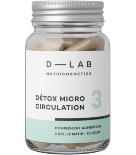 3Suisses : Un complément alimentaire parfait pour relancer la microcirculation et détoxifier la peau Pour prendre soin de votre peau, misez sur le Détox Microcirculation de chez D-Lab. Ce complément alimentaire possède une formule 100% naturelle qui relance la microcirculation pour réoxygéner et détoxifier l?organisme afin d?avoir une belle peau.Résultat : Suppression des toxinesPeau revitaliséeRelance de la microcirculationComposition : L?alchémille stimule la circulation sanguine.La chlorelle détoxifie les cellules et les tissus.La vigne rouge bio favorise la relance de la circulation veineuse.Le chardon-marie garde le foie en bonne santé et stimule la régénération rapide des tissus.Le marron d?Inde favorise la microcirculation pour mieux acheminer les micro-nutriments.Le fer aide le sang à mieux transporter l?oxygène vers les tissus. 2 gélules par jour.Privilégier une prise le matin au cours du petit-déjeuner pour éviter que les organes d'élimination, hautement sollicités, ne tournent à vide.Pour des effets optimaux, il est conseillé de suivre cette cure au moins 3 mois de suite.Il est conseillé de renouveler cette cure 1 à 2 fois par an. Marque: D-Lab ...