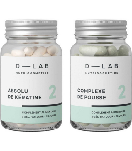 3Suisses : Pour des cheveux impeccables Si vous avez envie d?avoir une belle chevelure, misez sur le Duo Nutrition-Capillaire des laboratoires D-Lab. Ce set comprend deux compléments alimentaires qui accélèrent la repousse et revitalisent les poils pour des cheveux incroyablement lisses, brillants et forts.Le duo comprend : Un Absolu de KératineUn Complexe de PousseRésultat : Réduction des risques de chutes et de cassuresAccélération de la repousseChevelure revitaliséeComposition ; La kératine fortifie et répare les cheveux.La roquette favorise la repousse des cheveux.La prêle des Champs titrée en silice stimule la croissance des cheveux et améliore leur structure.La spiruline nourrit intensément les cheveux.Les vitamines B5, B8 et B9 aident à la croissance des cheveux.Les acides aminés (L-Arginine, L-Cystine, L-Méthionine) protègent les cheveux des dommages. Absolu de Kératine : 1 comprimé par jour.Complexe de Pousse : 2 gélules par jour.À consommer dans la journée, au moment que vous préférez.Il est nécessaire de suivre cette cure 3 mois de suite pour enclencher la mémoire cellulaire et avoir des résultats visibles et durables sur la fibre capillaire.Cette cure peut être consommée en continu, tout au long de l?année. Marque: D-Lab ...