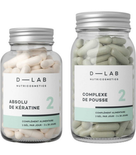 3Suisses : Le secret d?une chevelure bien épaisse et forte Pour fortifier vos cheveux sans utiliser de produits cosmétiques, misez sur le Duo Nutrition-Capillaire 3 Mois de chez D-Lab. Ce set comprend deux compléments alimentaires qui favorisent la repousse et renforcent les poils des racines jusqu?aux pointes pour éviter les chutes et les cassures.Le duo comprend : Un Absolu de KératineUn Complexe de PousseRésultat : Cheveux épais, souples et fortifiésAccélération de la pousseRéduction de risques de chutesComposition : La kératine fortifie et répare les cheveux.La roquette et la prêle des champs stimulent la repousse des cheveux.La spiruline nourrit intensément les cheveux.Les vitamines B5, B8 et B9 apportent des éléments essentiels à la croissance des cheveux.Les acides aminés (L-Arginine, L-Cystine et L-Méthionine) réparent et fortifient les cheveux. Absolu de Kératine : 1 comprimé par jour.Complexe de Pousse : 2 gélules par jour.A consommer dans la journée, au moment que vous préférez.Il est nécessaire de suivre cette cure 3 mois de suite pour enclencher la mémoire cellulaire et avoir des résultats visibles et durables sur la fibre capillaire.Cette cure peut être consommée en continu, tout au long de l?année. Marque: D-Lab ...