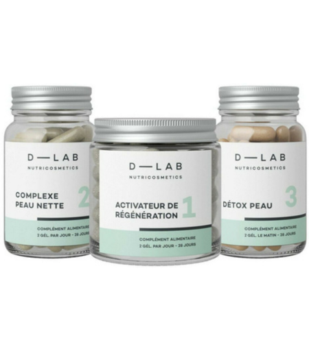 3Suisses : Pour une peau impeccable au quotidien Prenez grand soin de votre peau sans trop utiliser de produits cosmétiques avec le Programme Peau Parfaite 2 Mois de chez D-Lab. Il comprend trois compléments alimentaires qui vous aideront à avoir une belle peau sans imperfections.Le programme comprend : Un Activateur de RégénérationUn Complexe Peau NetteUn Détox PeauRésultat : Suppression des imperfectionsPores resserrésStabilisation de la production de sébumPeau ferme, douce et protégéeComposition : L?ortie piquante élimine les toxines et stabilise la production de sébum.La pensée sauvage aide à assainir les tissus cutanés.L?artichaut détoxifie la peau et protège les cellules et les tissus.Le bambou hydrate la peau en profondeur.Le zinc microencapsulé stimule la cicatrisation et prévient les rougeurs.La bardane apaise, purifie et protège la peau. 2 gélules de chaque par jour.Le matin sauf pour l'Activateur de Régénération qui est conseillé le soir pour une action la nuit, lorsque la peau se régénère.Pour des effets optimaux, il est conseillé de suivre cette cure 2 mois de suite.Il est conseillé de renouveler la cure 1 à 2 fois par an. Marque: D-Lab ...