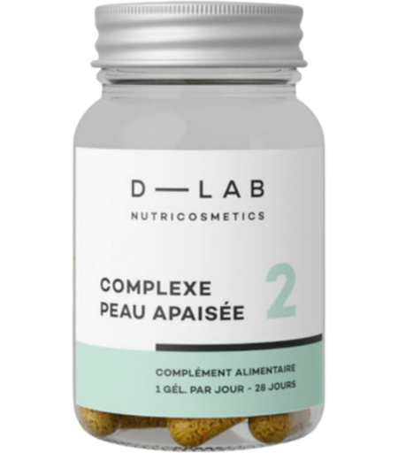 3Suisses : Pour une peau en bonne santé Le Complexe Peau Apaisée est un complément alimentaire spécialement conçu pour apaiser et protéger la peau. Il possède une formule naturelle testé cliniquement qui promet des résultats surprenant sans aucun effet secondaire.Résultat : Peau apaisée, fortifiée et nourrieComposition : Le zinc microencapsulé protège les cellules du stress oxydatif tout en améliorant la qualité de la peau.Le super-oxyde dismutase (SOD) de melon prévient la production de l?organisme des radicaux libres responsables du vieillissement cellulaire. Il calme et protège des inflammations.L?huile de chanvre bio hydrate la peau et apaise les inflammations. Il aide aussi à lutter contre les rougeurs et les acnés.L?acérola, riche en vitamine C, stimule la production de collagène.Le centella asiatica régénère la peau et accélère la cicatrisation.La camomille romaine apaise les inflammations cutanées. Prendre une gélule par jour à tout moment de la journée.Pour des effets optimaux, il est conseillé de suivre cette cure au moins 3 mois de suite. Marque: D-Lab ...