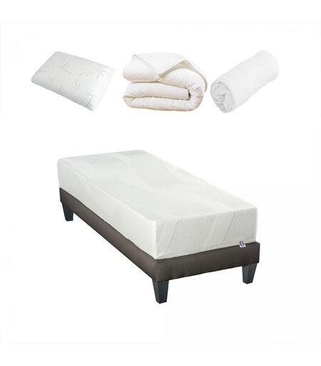 3Suisses : Cet Ensemble prêt à dormir PARIS - Victoire 15cm est idéal pour moderniser votre chambre. Traité anti-acariens et antibactériens, le matelas promet hygiène, accueil enveloppant, souplesse et indépendance de couchage. Le sommier, quant à lui, garantit une grande résistance et s?équipe de 4 pieds et de lattes. L?ensemble s?accompagne d?un protège-matelas, d?une couette et d?un oreiller. CARACTÉRISTIQUES Matelas : Dimensions : 90 x 190 cm, 90 x 200 cm, 140 x 190 cm, 140 x 200 cm, 160 x 200 cm, 180 x 200 cm Epaisseur : 15 cm Technologie : Mémoire de forme Accueil : Enveloppant Soutien : Ferme Indépendance de couchage : 5/5 Aération : 4/5 Fabrication : Française Déhoussable : Oui Garantie : 10 ans Livré compressé roulé COMPOSITION : Âme intérieure (CertiPUR) : 17,5 cm de mousse Haute Densité de 33 kg/m³ + 6,5 cm de mousse à mémoire de forme AIR OPTIMA® de 60 kg/m³ Coutil (Oeko-Tex) : Tissu stretch 100 % PES de 300 gr/m² avec face sommier antidérapante POINTS FORTS : Ergonomie Indépendance de couchage Soutien Hygiène CARACTÉRISTIQUES Sommier : Dimensions : 90 x 190 cm, 90 x 200 cm, 140 x 190 cm, 140 x 200 cm, 160 x 200 cm, 180 x 200 cm Suspension : Lattes Technologie : Tri-lattes Hauteur (avec pieds) : 30 cm Nombre de pieds : 4 Nombre de lattes : 24, 48 Matière : Bois Couleur revêtement : Gris Garantie : 5 ans Livré en kit POINTS FORTS : Robustesse Confort Hygiène Intégrable dans un cadre de lit Accessoires inclus 1 ou 2 Oreiller mémoire de forme 40 x 60 cm 1 Couette synthétique thermo-isolante 1 Protège matelas absorbant Marque: Bellecour ...