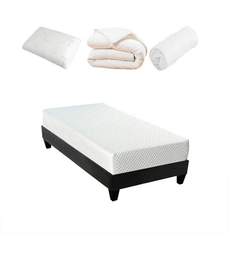 3Suisses : Découvrez le Matelas Adulte Bellecour, un véritable bijou de confort et de style authentique. Le Pack Prêt à dormir Absolu est composé d?1 matelas et d?1 oreiller tous les 2 à mémoire de forme pour un confort optimal, d?1 couette synthétique thermo isolante, d?1 protège matelas absorbant et d?1 sommier à lattes habillé d?un élégant tissu gris anthracite (pieds inclus). CARACTERISTIQUES MATELAS : Epaisseur 21 cm - Accueil : Tonique - Soutien : Ferme - Indépendance de couchage : Très bonne - Aération : Très bonne - Déhoussable.Fabrication Européenne - Garantie 10 ans Marque: Bellecour ...