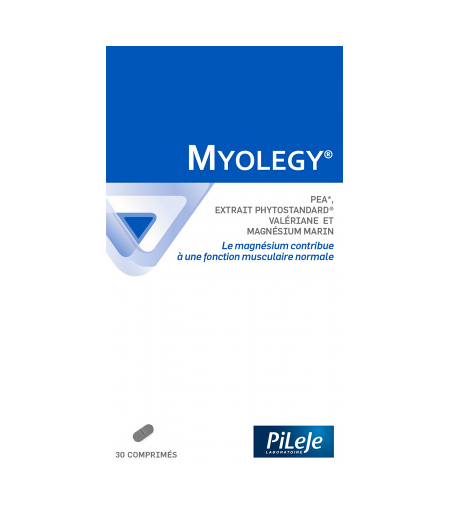 Les muscles ont un rôle déterminant sur de nombreuses fonctions de l’organisme (respiration, digestion). Il existe trois types de muscles : le muscle cardiaque, le muscle squelettique et le muscle lisse. Le muscle squelettique, composé d’un ensemble de fibres, permet le mouvement à travers trois situations principales : le relâchement, l’étirement ou la contraction volontaire. En l’absence de stimulation volontaire, certains désagréments tels que des contractures musculaires peuvent apparaitre au niveau de la fonction musculaire de manière persistante. Cela peut notamment se produire au niveau d'un muscle peu sollicité ou lors d'un effort très intense de celui-ci. Pour vous accompagner, le laboratoire PiLeJe a développé Myolegy, un complément alimentaire à base de : Palmitoyléthanolamide (PEA)Extrait Phytostandard® ValérianeMagnésium marin qui contribue au maintien d’une fonction musculaire normale Qu’est-ce que le PEA ou Palmitoyléthanolamide ? Le PEA (palmitoyléthanolamide) est une molécule naturellement synthétisée par l’organisme. Il fait partie du système endocannabinoïde, un ensemble de récepteurs cellulaires et de molécules situés dans notre corps qui régulent de nombreux processus physiologiques. À base de : Magnésium marin, Palmitoyléthanolamide (PEA), Extrait Phytostandard® Valériane Besoin adressé par les produits : Fonction musculaire Durée : 15 jours ...